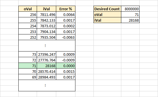 That's great but we can only work with integers. iVal must be rounded to the nearest whole number which will give us a slight error. Plugging 7842 back into our equation for clock cycles, we get 7999864, which has an error of 0.0017%. Terrible approximation, right?